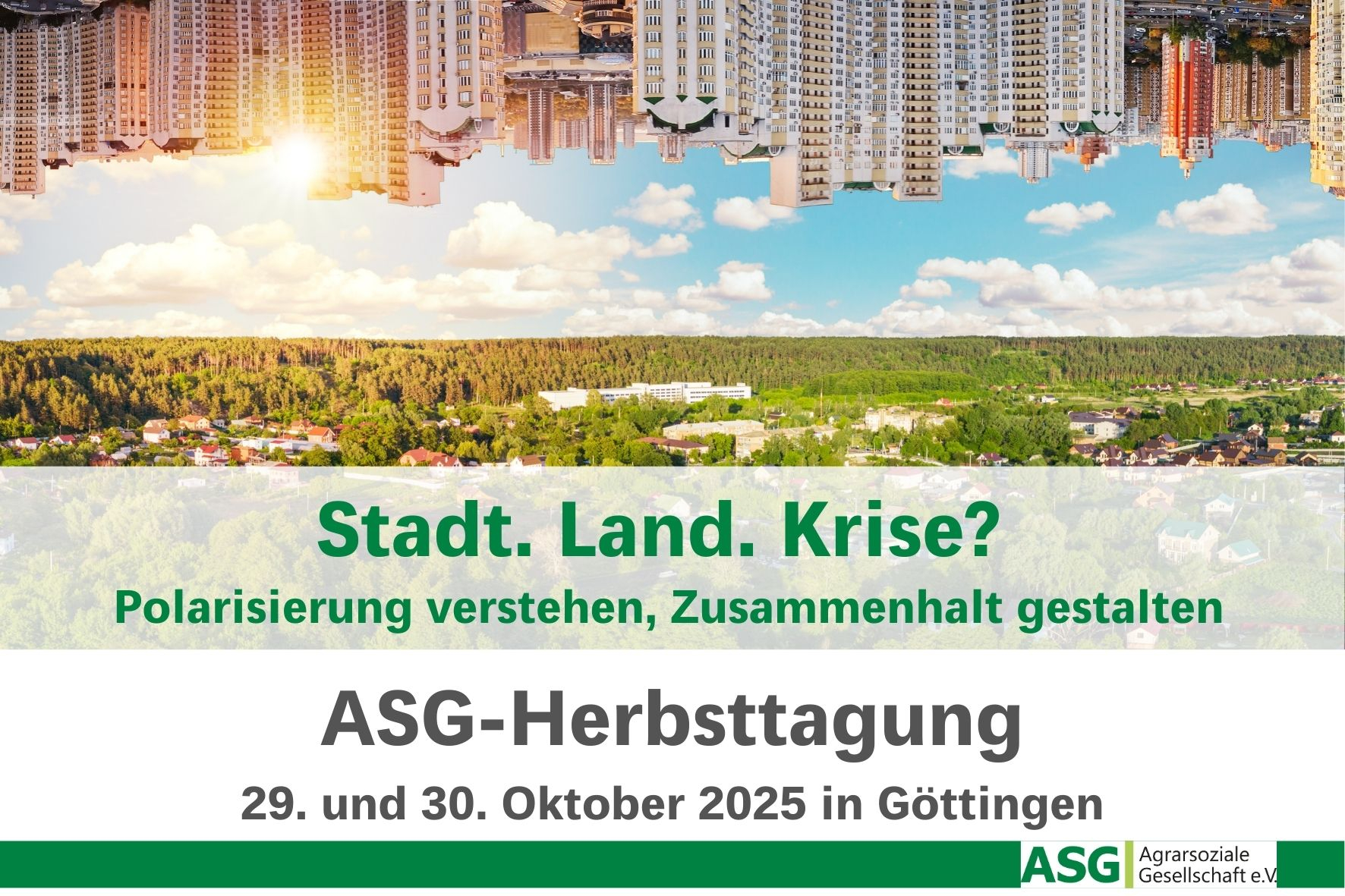 Die Agrarsoziale Gesellschaft e.V. (ASG) lädt auch in diesem Jahr zur Herbsttagung ein und widmet sich vom 29. – 30. Oktober 2025 in Göttingen dem Themenschwerpunkt „Stadt.Land.Krise? Polarisierung verstehen, Zusammenhalt gestalten“.