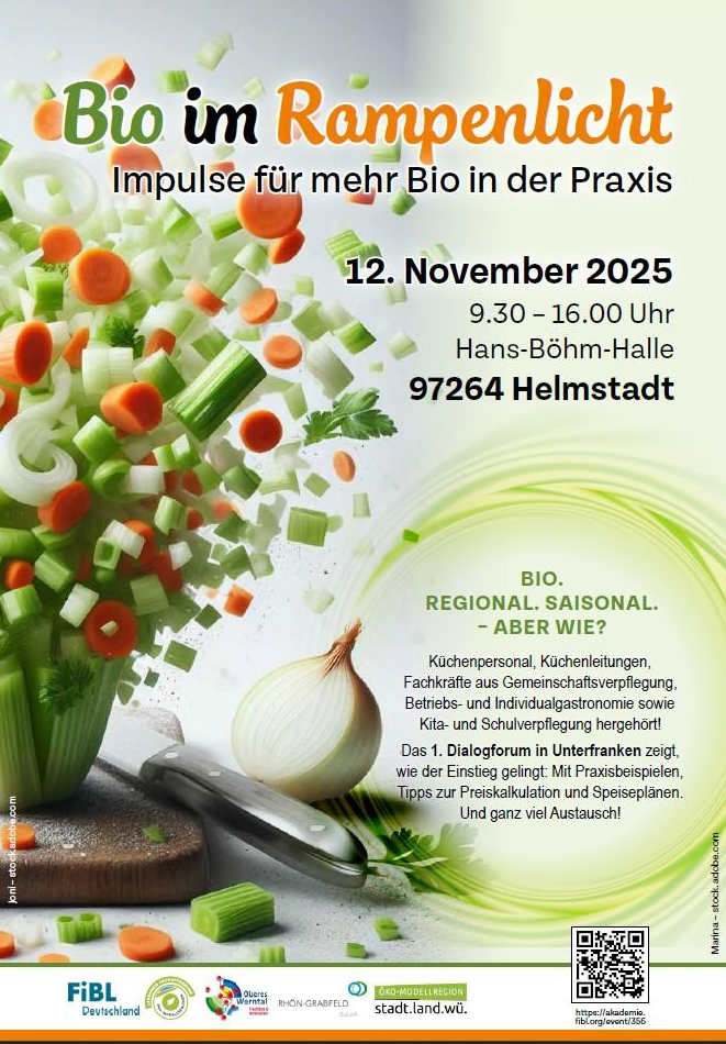 Am Mittwoch, 12. November 2025 findet erstmals in Unterfranken das Dialogforum „Bio im Rampenlicht“ statt. Im Mittelpunkt stehen praxisnahe Ansätze und Erfahrungen von Chancen zum Einsatz von Bio-Produkten in der Gemeinschaftsverpflegung: Von der kostenneutralen Integration von Bio-Produkten in den Speiseplan bis hin zum Austausch mit erfahrenen Fachleuten aus der Branche. Abgerundet wird das Programm durch eine Exkursion zu einem Bio-Betrieb in der Region.