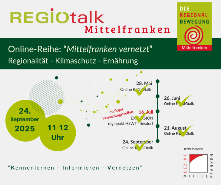 Intensiven Vernetzungscharakter bot die Veranstaltungsreihe REGIOtalk - Mittelfranken vernetzt, die als offenes Dialogformat konzipiert wurde. Hier standen Austausch, Praxisbeispiele und Impulse zu relevanten Fragen rund um nachhaltige kommunale Ernährungspolitik im Mittelpunkt.