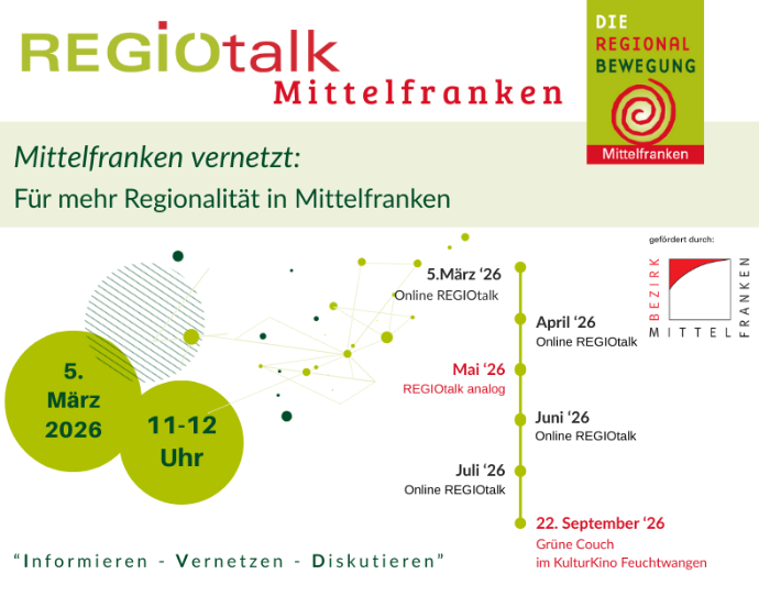 Mit dem Projekt „Mittelfanken vernetzt“ fördert die IG Regionalbewegung Mittelfranken Austausch und Vernetzung zu einer regionalen Ernährungspolitik – praxisnah, klimafreundlich und zukunftsorientiert. Die begleitende Veranstaltungsreihe REGIOtalk lädt Akteure, die an der Schnittstelle von Regionalität, Klimaschutz und Ernährung arbeiten, zum Austausch und zur Vernetzung ein.